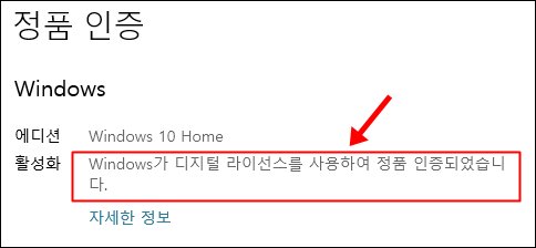 물론, 제 컴퓨터에 설치된 윈도우 10은 정품인증이 된 상태였습니다. 문제는 어찌어찌하여 꼬였는지, 야간모드가 비활성화 되어 있을때 저 빨간 부분이 지워져 있었다는 겁니다.