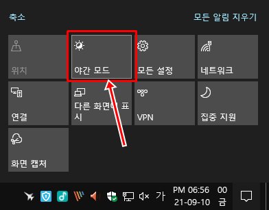 활성화 해 놓은 후, 하루에도 몇번씩 보는 알림센터(바탕화면 오른쪽 아래 시계 옆에 있는 것)를 클릭하였는데, 비활성화 되어 회색으로 보이던 야간모드가 하얀색으로 바뀌어 있지 모에요.