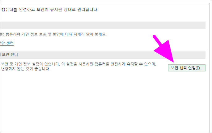 3. 보안 센터에서 보안 센터 설정을 선택하여 주세요.