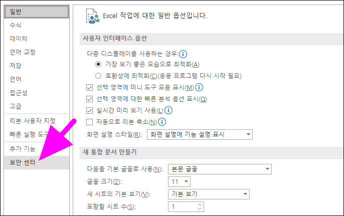 2. 옵션으로 이동한 후, 보안 센터를 선택해 주세요.