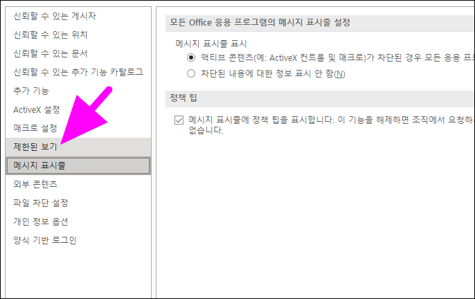 5. 제한된 보기에서 함 보세요. "인터넷에서 가져온 파일에 대해 제한된 보기 사용" 이 체크되어 있을 것입니다. 체크를 없애 주세요.